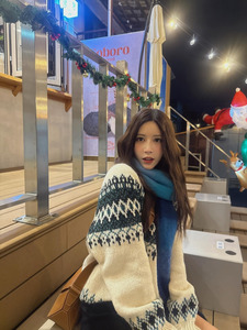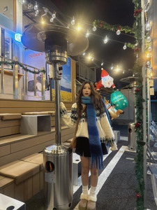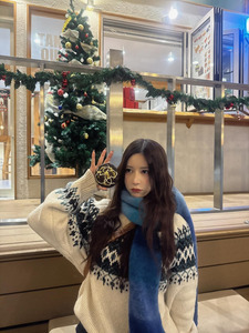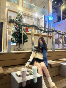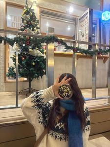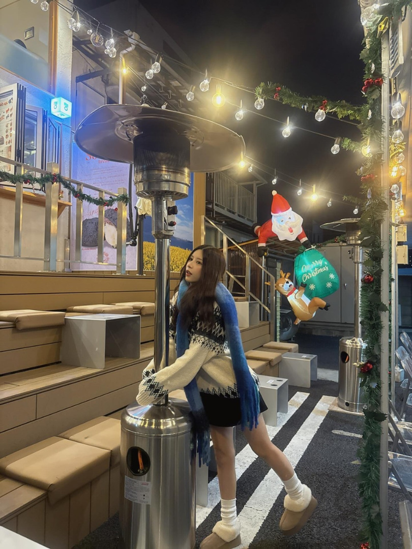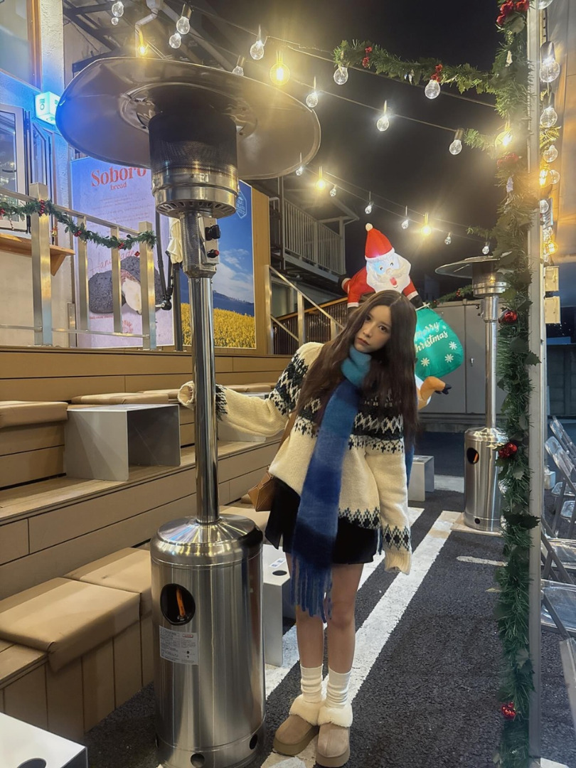 คุณนานัตสึโมริโพสต์ภาพในลุคแฟชั่นฤดูหนาว พร้อมแคปชั่นเป็นอิโมจิรูปต้นคริสต์มาส กล่องของขวัญ และโบว์