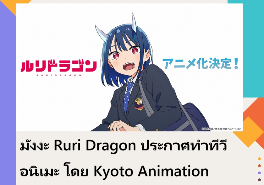 Ruri Dragon (รูริ ดราก้อน) มังงะยอดนิยมแนวชีวิตประจำวันของอาจารย์ชินโด มาซาโอกิ (Shindo Masaoki) ประกาศสร้างในรูปแบบทีวีอนิเมะอย่างเป็นทางการ พร้อมกับได้สตูดิโอคุณภาพสูงอย่าง Kyoto Animation มารับผิดชอบการผลิตในครั้งนี้