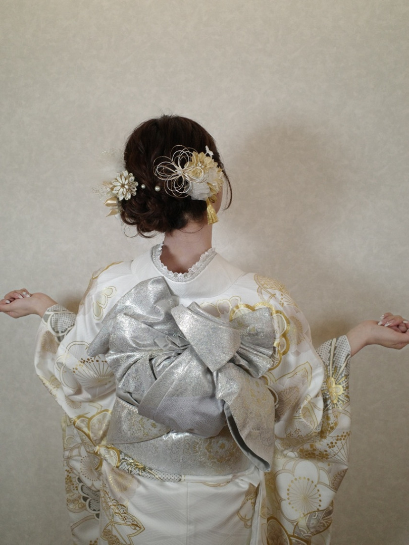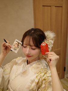 "แล้วก็ชุดในวันนี้คือชุดฟุริโซเดะค่ะ เป็นสีขาวทองที่ดูเป็นสิริมงคล แบบที่ไม่เคยใส่มาก่อนเลย"