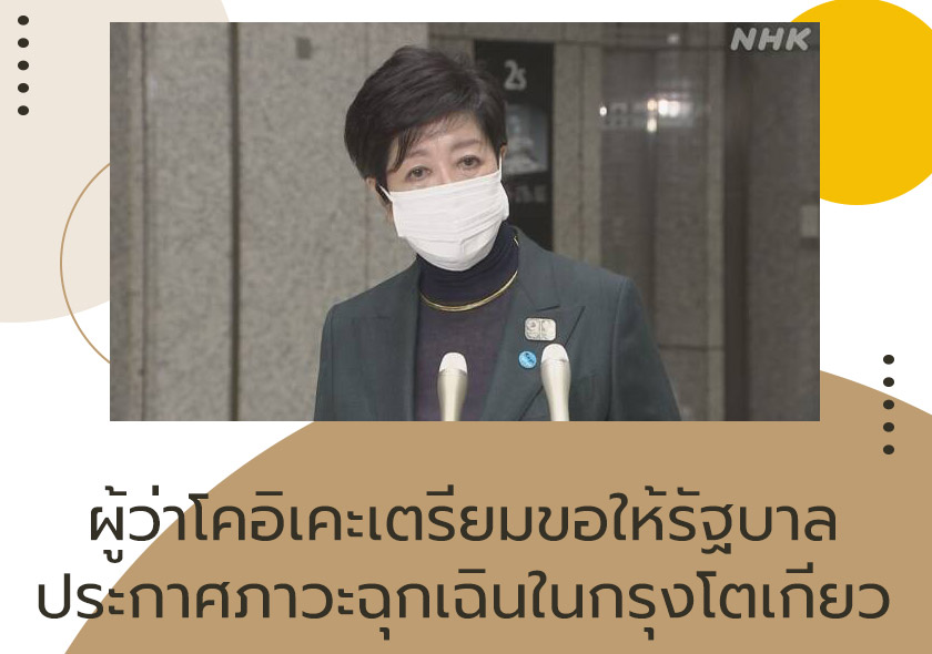 นางโคอิเคะ ยูริโกะ ผู้ว่าการกรุงโตเกียว เตรียมขอให้รัฐบาลออกประกาศภาวะฉุกเฉินในกรุงโตเกียวเพื่อควบคุมการเดินทางของประชาชนหลังตัวเลขผู้ติดเชื้อในกรุงโตเกียวได้เพิ่มขึ้นอย่างเร็ว