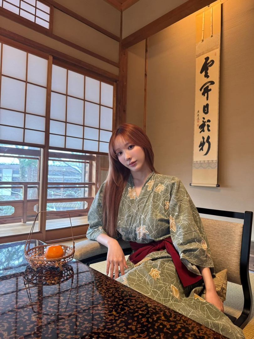 คุณโคโยอิโพสต์ภาพในชุดยูกาตะ พร้อมแคปชั่นว่า "ส้มที่นีงาตะอร่อยเว่อร์"