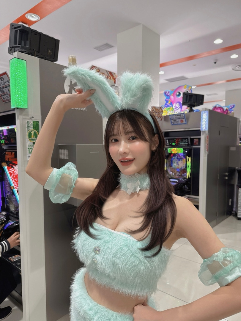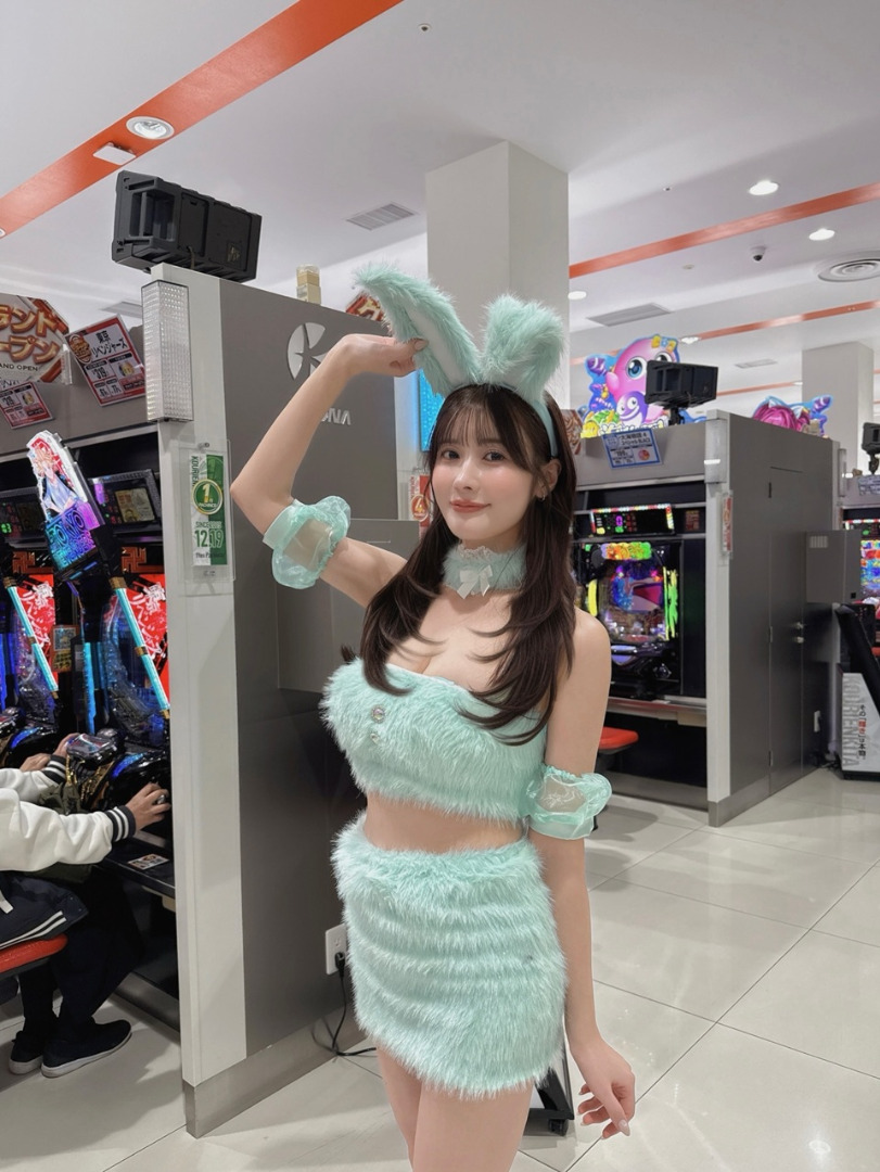 คุณฟูจิโมริโพสต์ภาพในชุดคอสเพลย์บันนี่สีมิ้นท์กลางร้านปาจิงโกะ พร้อมแคปชั่นเป็นอิโมจิรูปใบโคลเวอร์และกระต่าย