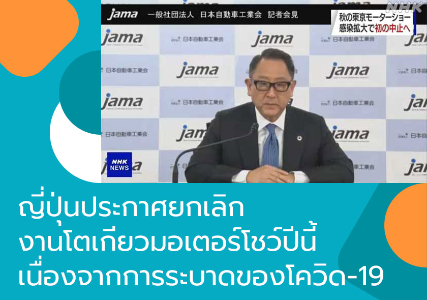 โทโยดะ อากิโอะ ประธานสมาคมผู้ผลิตยานยนต์แห่งญี่ปุ่นประกาศยกเลิกงานโตเกียวมอเตอร์โชว์ที่มีกำหนดจัดขึ้นในช่วงฤดูใบไม้ร่วงในปีนี้เนื่องจากการแพร่ระบาดอย่างหนักของโควิด-19