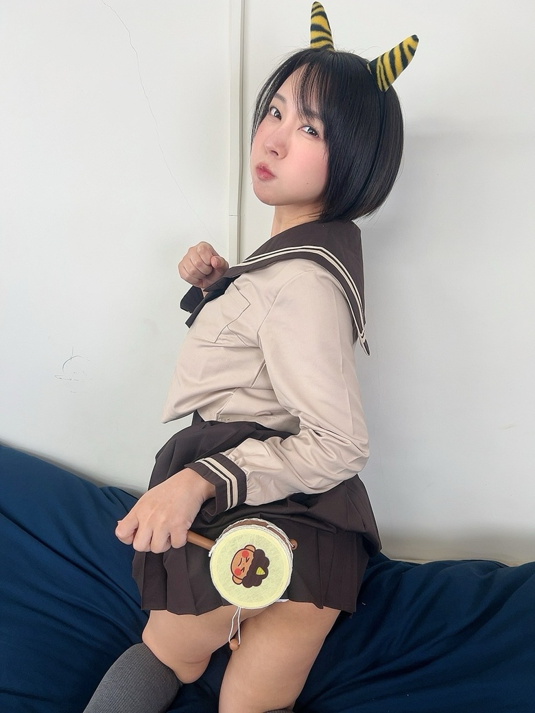 คุณฮานิวโพสต์ภาพคอสเพลย์ชุดนักเรียนและเขาลายเสือ พร้อมแคปชั่นดังนี้
