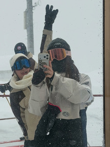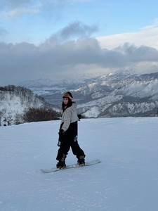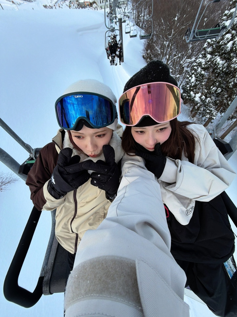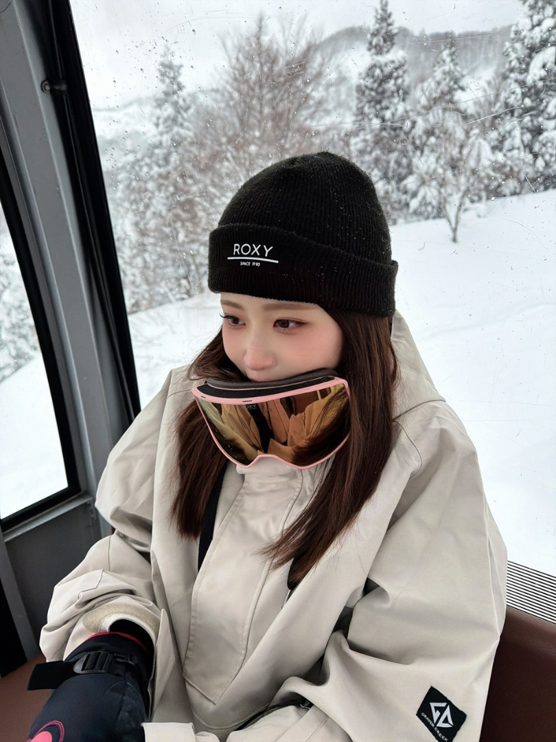 คุณอาโออิโพสต์ภาพตอนไปทริปสโนว์บอร์ด พร้อมแคปชั่นเป็นอิโมจิรูปตุ๊กตาหิมะ เกล็ดหิมะ และคนเล่นสโนว์บอร์ด