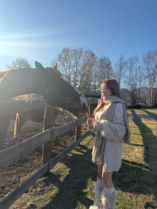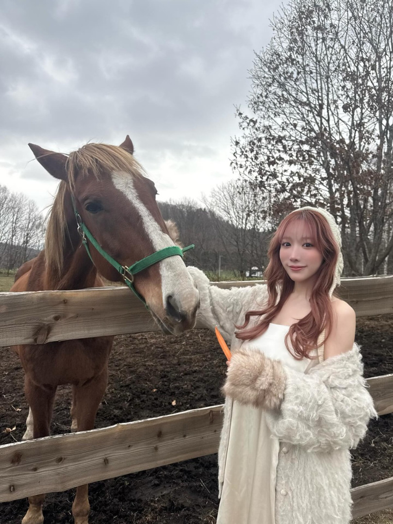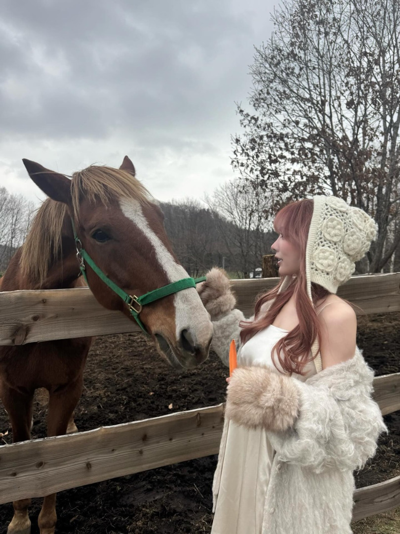 คุณโคโยอิโพสต์ภาพถ่ายคู่กับม้ากลางบรรยากาศหน้าหนาว พร้อมแคปชั่นว่า "อยากขี่ม้าอีกจัง"