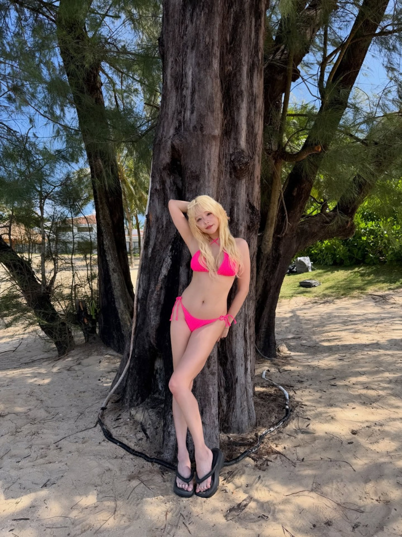 คุณฮามาซากิโพสต์ภาพนุ่งบิกินี่สีชมพูริมชายหาด พร้อมแคปชั่นว่า "สุขสันต์วันวาเลนไทน์"