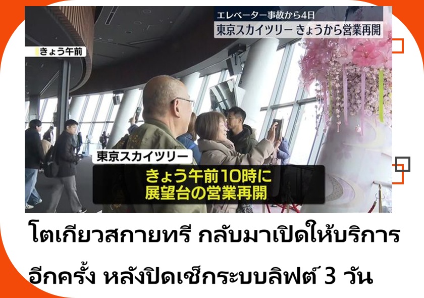 โตเกียวสกายทรี (Tokyo Skytree) หอคอยที่เปรียบดั่งแลนด์มาร์กสำคัญของกรุงโตเกียวและประเทศญี่ปุ่น ได้กลับมาเปิดให้บริการตามปกติอีกครั้งในวันที่ 26 กุมภาพันธ์ เวลา 10:00 น. ตามเวลาท้องถิ่น หลังจากปิดทำการชั่วคราวเป็นเวลา 3 วัน เพื่อตรวจสอบความปลอดภัยของระบบลิฟต์อย่างละเอียด สืบเนื่องจากเหตุการณ์ลิฟต์ค้างเมื่อช่วงสุดสัปดาห์ที่ผ่านมา