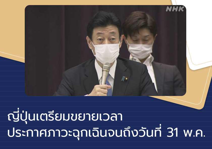 รัฐบาลญี่ปุ่นเตรียมขยายเวลาประกาศภาวะฉุกเฉินใน 4 จังหวัด ได้แก่ กรุงโตเกียว โอซาก้า เฮียวโกะ และเกียวโต จากเดิมวันที่ 11 พฤษภาคม เป็นวันที่ 31 พฤษภาคม เนื่องจากสถานการณ์การแพร่ระบาดของเชื้อหลังช่วงโกลเด้นวีคที่ผ่านมายังคงไม่ดีขึ้น