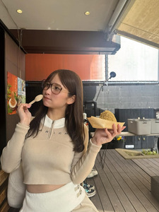 คุณโมโมโซโนะโพสต์ภาพลุคสาวแว่นทานมงบล็อง พร้อมแคปชั่นว่า "มงบล็องที่กินที่ฮาโกเนะอร่อยมากเลยค่ะ"